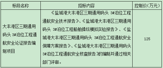 4、招標內容:大豐港區三期通用碼頭3#泊位工程通航安全論證報告編制,具體內容詳見招標需求。