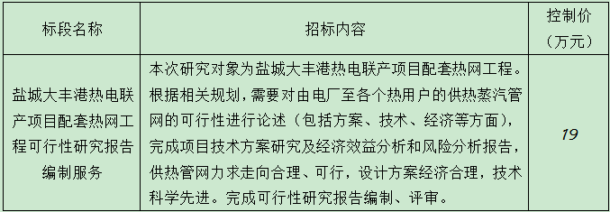 鹽城大豐港熱電聯(lián)產項目配套熱網工程可行性研究報告編制服務已經相關部門批準實施, 項目所需資金來源自籌已落實。現決定對該項目進行公開招標,擇優(yōu)選定承包人。