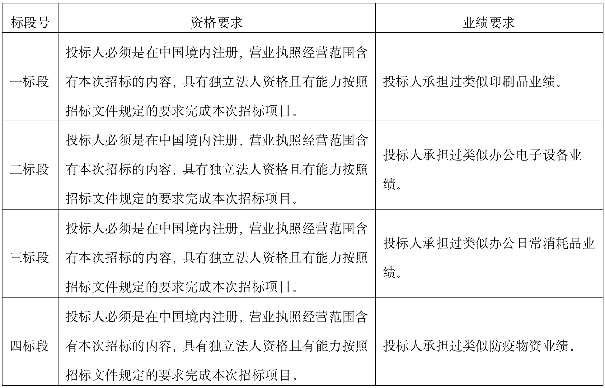 5、各標(biāo)段投標(biāo)人資格及業(yè)績(jī)要求見下表: