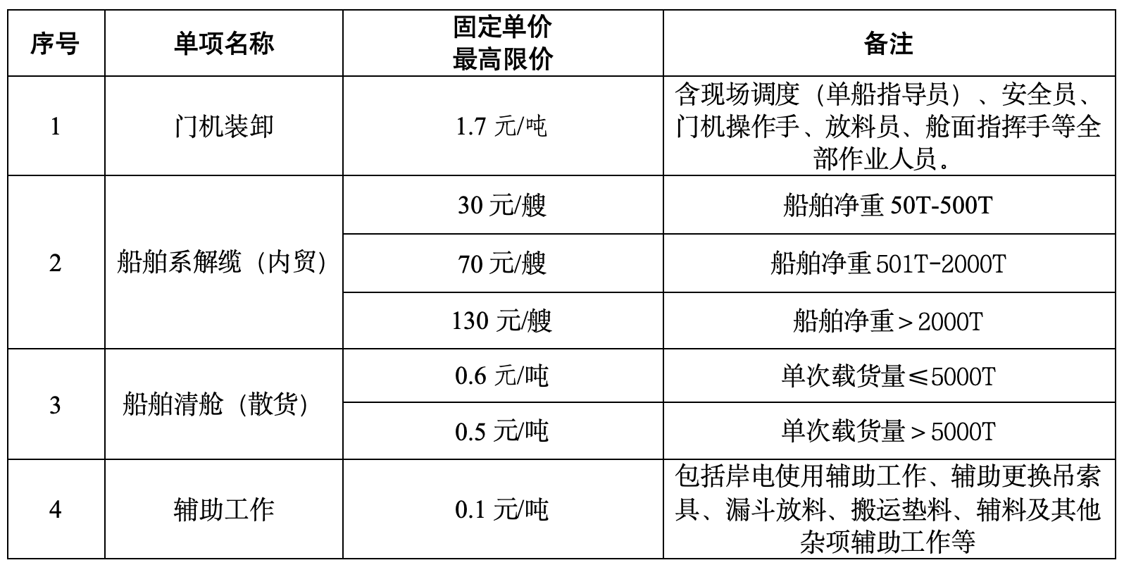 2、招標(biāo)內(nèi)容:萬噸級通用碼頭4#泊位裝卸作業(yè)、船舶清艙業(yè)務(wù)外包服務(wù)包括(包括但不限于):射陽港4#通用泊位的裝卸搬運(yùn):含現(xiàn)場調(diào)度(單船指導(dǎo)員)、安全員、門機(jī)操作手、放料員、艙面指揮手等全部作業(yè)人員(包括招標(biāo)人提供:2臺門機(jī)、2臺漏斗;投標(biāo)人自備:裝載機(jī)、運(yùn)輸車輛、通勤車輛等設(shè)備操作);輔助工作:岸電使用輔助工作、輔助更換吊索具、漏斗放料、搬運(yùn)墊料、輔料及其它雜項(xiàng)輔助工作;船舶清艙:含機(jī)械、人工入艙清理(含指揮)、道口至碼頭面區(qū)域的清理工作;船舶系解纜(船舶解、系纜及其輔助工作)等,詳見招標(biāo)需求。招標(biāo)人保留對招標(biāo)范圍進(jìn)行調(diào)整的權(quán)利。