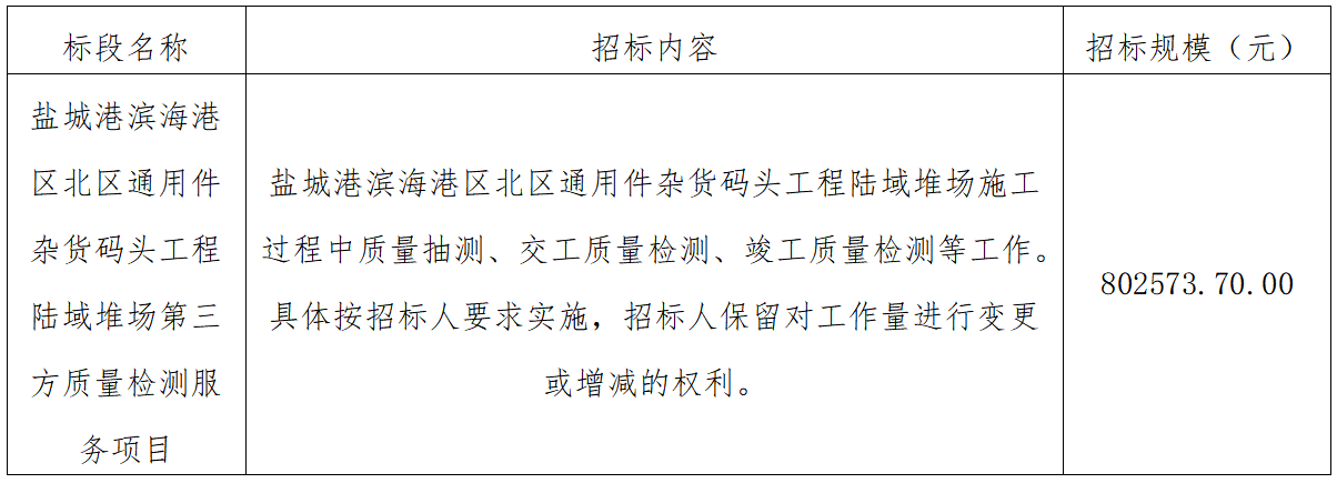一、江蘇鹽城港濱海港開發(fā)集團有限公司負責實施的鹽城港濱海港區(qū)北區(qū)通用件雜貨碼頭工程陸域堆場第三方質量檢測服務項目已具備招標條件,項目所需資金已落實,現(xiàn)通過公開招標方式邀請潛在投標人參加本項目的投標。