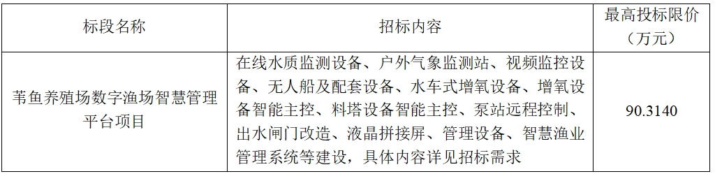 (6)項目標(biāo)段劃分:葦魚養(yǎng)殖場數(shù)字漁場智慧管理平臺項目共劃分1個標(biāo)段,標(biāo)段信息如下: