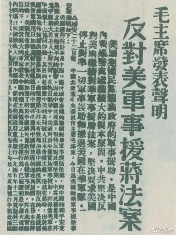 毛澤東以中共中央主席名義發(fā)表《反對(duì)美國(guó)對(duì)蔣軍事援助法案的聲明》。聲明指出:美國(guó)國(guó)務(wù)院于本月十四日提付國(guó)會(huì)審議的繼續(xù)對(duì)華軍事援助法案,對(duì)中國(guó)的和平安定與獨(dú)立民主有極為不利的影響,因此中國(guó)共產(chǎn)黨堅(jiān)決反對(duì)此項(xiàng)法案。中共此種意見(jiàn),并為中國(guó)廣大民主人士所支持。在抗日戰(zhàn)爭(zhēng)中,美國(guó)對(duì)于中國(guó)實(shí)施軍事援助,并派遣美軍在中國(guó)領(lǐng)土上協(xié)同作戰(zhàn),其目的是擊敗中美的共同敵人日本帝國(guó)主義,但就在那時(shí),由于美國(guó)錯(cuò)誤地僅僅援助國(guó)民黨軍閥,這種援助也并未有效地加強(qiáng)中國(guó)的抵抗,相反地是被國(guó)民黨軍閥用以加強(qiáng)其對(duì)于積極抗日的中國(guó)共產(chǎn)黨與中國(guó)解放區(qū)的進(jìn)攻與封鎖。在日本投降以后,美國(guó)沒(méi)有停止反而極大地加強(qiáng)了對(duì)于中國(guó)國(guó)民黨政府的各種軍事援助,并在此實(shí)際目的下派遣龐大的軍隊(duì)駐在中國(guó)的領(lǐng)土與領(lǐng)海之上,這種行動(dòng)已經(jīng)證明是中國(guó)大規(guī)模內(nèi)戰(zhàn)爆發(fā)與繼續(xù)擴(kuò)大的根本原因。美國(guó)實(shí)行所謂軍事援助,實(shí)際上只是武裝干涉中國(guó)內(nèi)政,只是以強(qiáng)力支持國(guó)民黨獨(dú)裁政府繼續(xù)陷中國(guó)于內(nèi)戰(zhàn)、分裂、混亂、恐怖和貧困,只是使中國(guó)不能實(shí)現(xiàn)整軍復(fù)員和履行其對(duì)于聯(lián)合國(guó)的義務(wù),只是危害中國(guó)國(guó)家安全獨(dú)立與領(lǐng)土主權(quán)完整,只是破壞中美兩大民族的光榮友誼與中美貿(mào)易的發(fā)展前途。在此種現(xiàn)實(shí)情況之下,中國(guó)共產(chǎn)黨不得不堅(jiān)決反對(duì)美國(guó)政府繼續(xù)以出售、交換、租借、贈(zèng)送或讓渡等方式將軍火交給中國(guó)的國(guó)民黨獨(dú)裁政府,堅(jiān)決反對(duì)美國(guó)派遣軍事使團(tuán)來(lái)華,并堅(jiān)決要求美國(guó)立即停止與收回對(duì)華的一切所謂軍事援助,和立即撤回在華的美國(guó)軍隊(duì)。