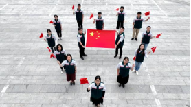 右圖:團(tuán)員與國旗合影