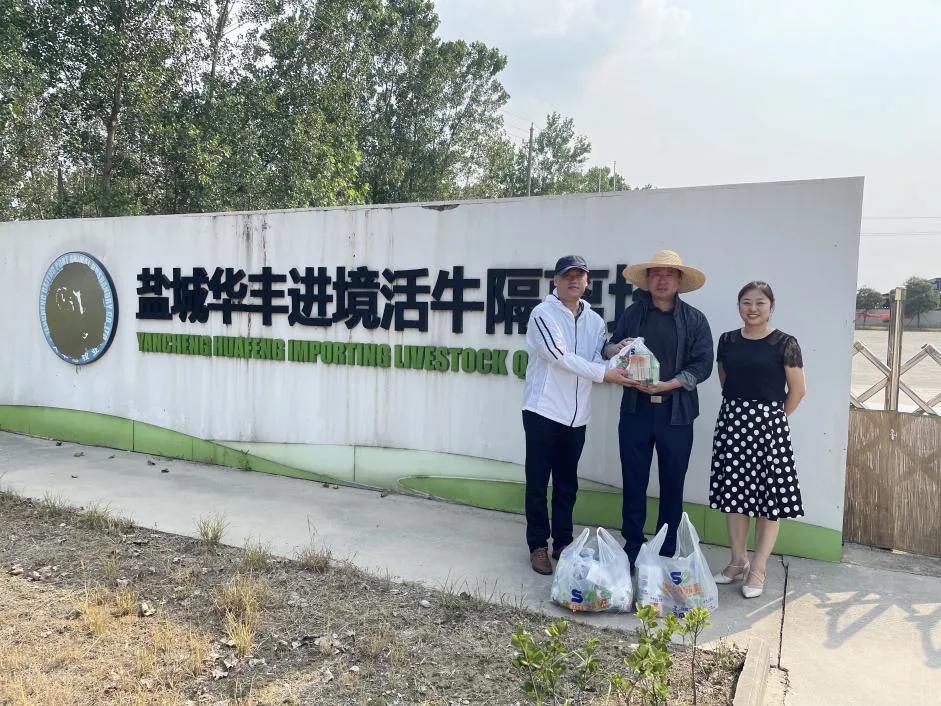 在大豐區(qū)華豐農(nóng)場(chǎng)進(jìn)境活牛隔離場(chǎng),慰問組親切看望了正在值班值守的一線人員,對(duì)他們冒酷暑、戰(zhàn)高溫,堅(jiān)守崗位,協(xié)調(diào)用水用電,保障進(jìn)境活牛安全隔離付出的努力表示贊賞。7月6日,北京牧華源國(guó)際貿(mào)易有限公司4999澳大利亞荷斯坦進(jìn)口活牛抵達(dá)華豐隔離場(chǎng),將在這里進(jìn)行為期45天檢疫隔離。為保證高溫高熱季節(jié)清潔水源充足,供應(yīng)鏈科技集團(tuán)多方協(xié)調(diào)消防車從外部運(yùn)水,實(shí)行24小時(shí)領(lǐng)導(dǎo)帶班值守,保障了隔離場(chǎng)的日常用水需求。