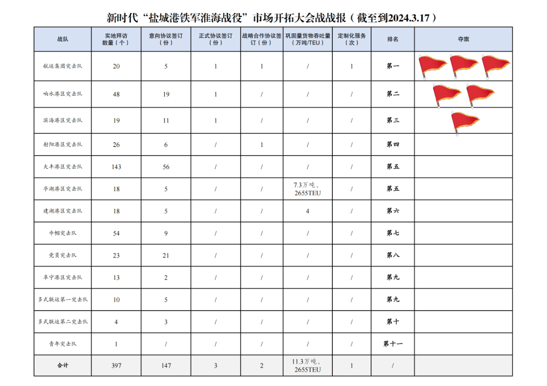 2.簽訂意向協(xié)議數(shù)量147份:其中大豐港區(qū)突擊隊56份,黨員突擊隊21份,響水港區(qū)突擊隊19份,濱海港區(qū)突擊隊11份,巾幗突擊隊9份,射陽港區(qū)突擊隊6份,航運集團突擊隊5份,亭湖港區(qū)突擊隊5份,建湖港區(qū)突擊隊5份,多式聯(lián)運第一突擊隊5份,多式聯(lián)運第二突擊隊3份,阜寧港區(qū)突擊隊2份。
