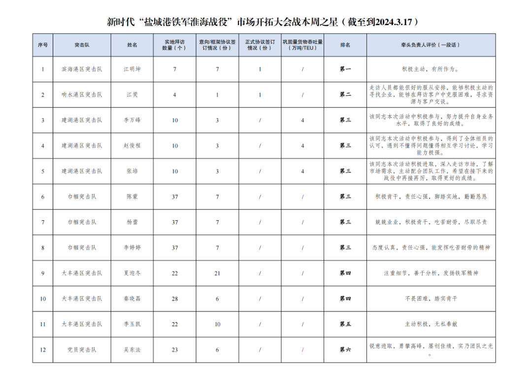 3.簽訂正式協(xié)議數(shù)量3份:其中航運集團突擊隊1份,響水港區(qū)突擊隊1份,濱海港區(qū)突擊隊1份。