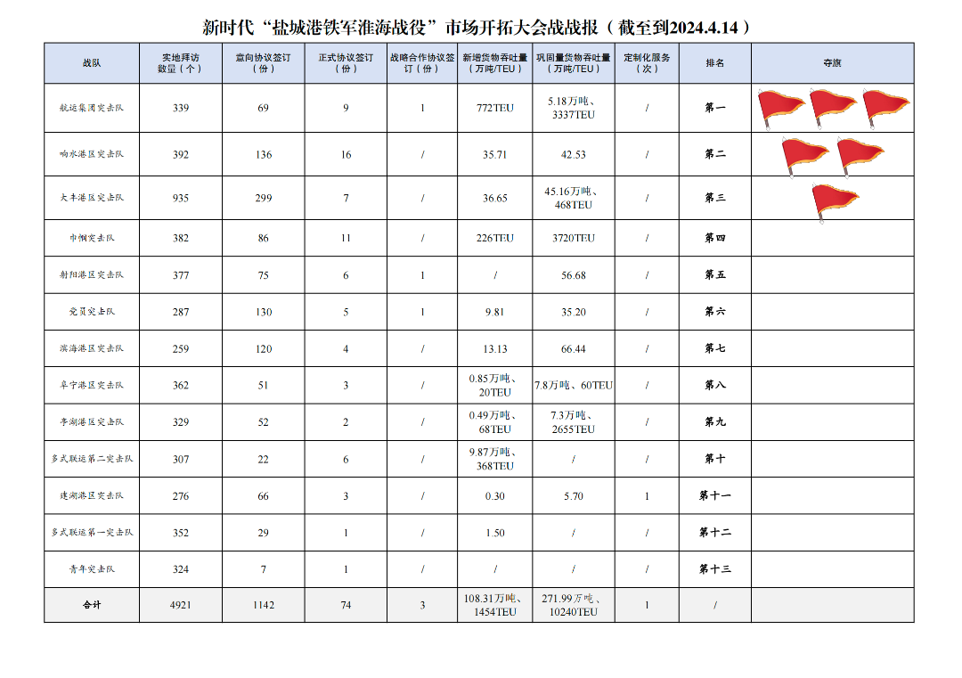 1.累計拜訪客戶數量4921家:其中大豐港區突擊隊935家,響水港區突擊隊392家,巾幗突擊隊382家,射陽港區突擊隊377家,阜寧港區突擊隊362家,多式聯運第一突擊隊352家,航運集團突擊隊339家,亭湖港區突擊隊329家,青年突擊隊324家,多式聯運第二突擊隊307家,黨員突擊隊287家,建湖港區突擊隊276家,濱海港區突擊隊259家。