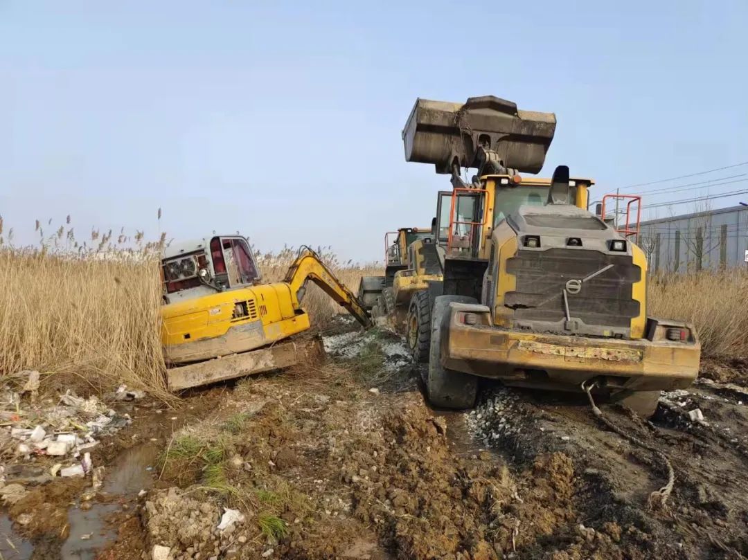面對連續的失敗,響水港區團隊再次展現出了百折不撓,迎難而上的港口工匠精神,深刻剖析前兩次失敗原因,再次調集一臺小型挖機對事件車輛輪子周邊淤泥進行清理,回填石子提升其自身摩擦力,同時針對涉險裝載機陷入太深可能造成底盤擱置等情況,調配一輛裝載機協助抬升予以解決,并再次調集一輛裝載機采用接力模式增加牽引力。經過多臺機械的通力配合,受困裝載機終于在拖拽中緩緩駛出泥潭,圓滿完成救援工作。