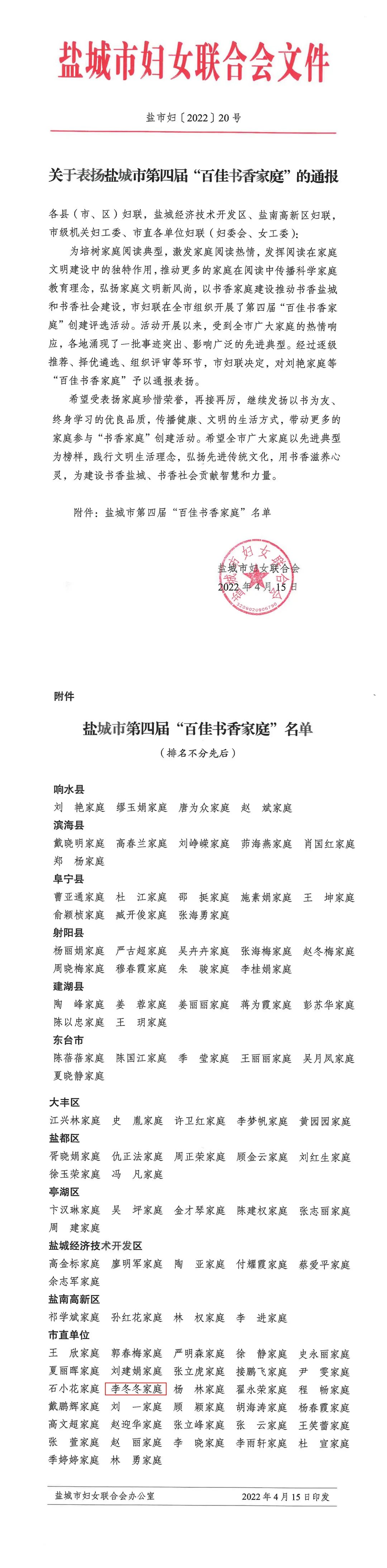 近日,從鹽城市婦女聯(lián)合會(huì)傳來(lái)好消息,在市第四屆“百佳書(shū)香家庭”評(píng)選活動(dòng)中,集團(tuán)下屬資產(chǎn)公司職工李冬冬家庭榮獲鹽城市“百佳書(shū)香家庭”稱(chēng)號(hào)。