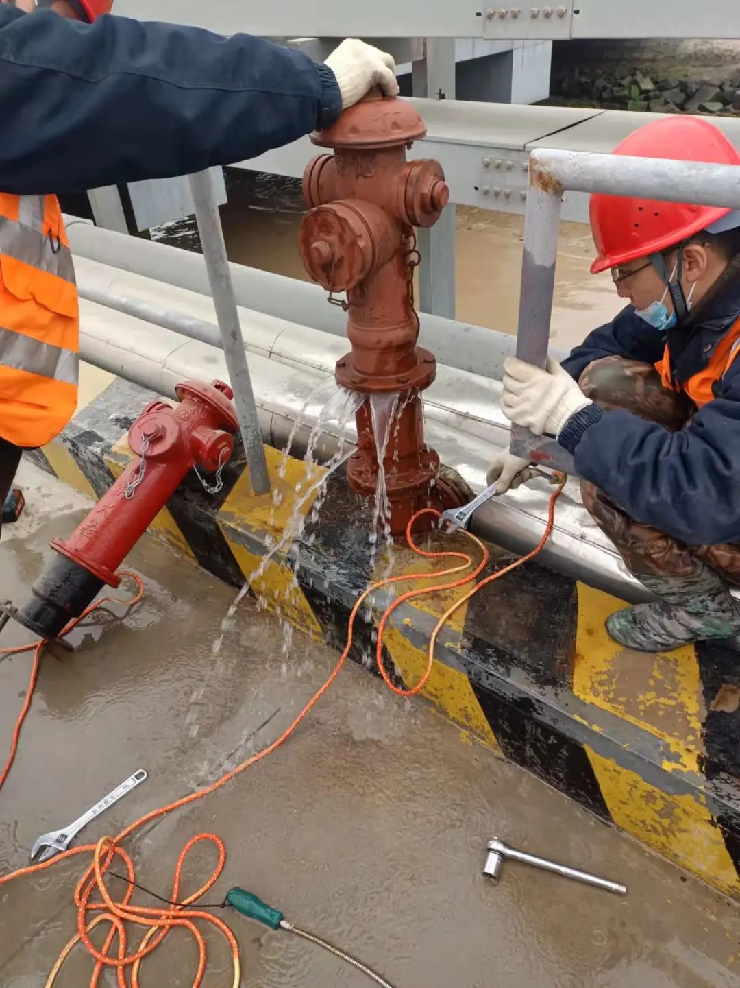 本次演練模擬惡劣天氣下港區(qū)碼頭消火栓爆裂,泄露出的水在碼頭路面結出冰面,并對往來車輛、人員造成了極大的安全隱患。港區(qū)巡查員發(fā)現隱患后,迅速向上級匯報并啟動應急預案,對破損消火栓進行維修和更換,并加裝防寒保溫套,同時對碼頭面結冰區(qū)域拋灑融雪劑。經過近半小時搶修,消防栓更換到位并停止漏水,碼頭面冰層消融,安全隱患排除。