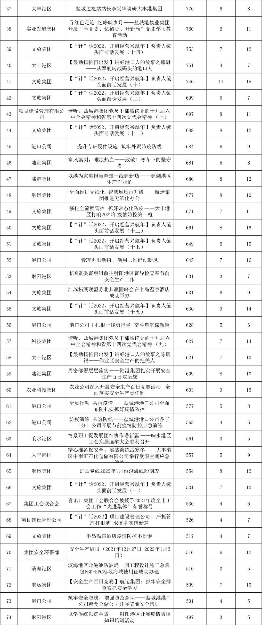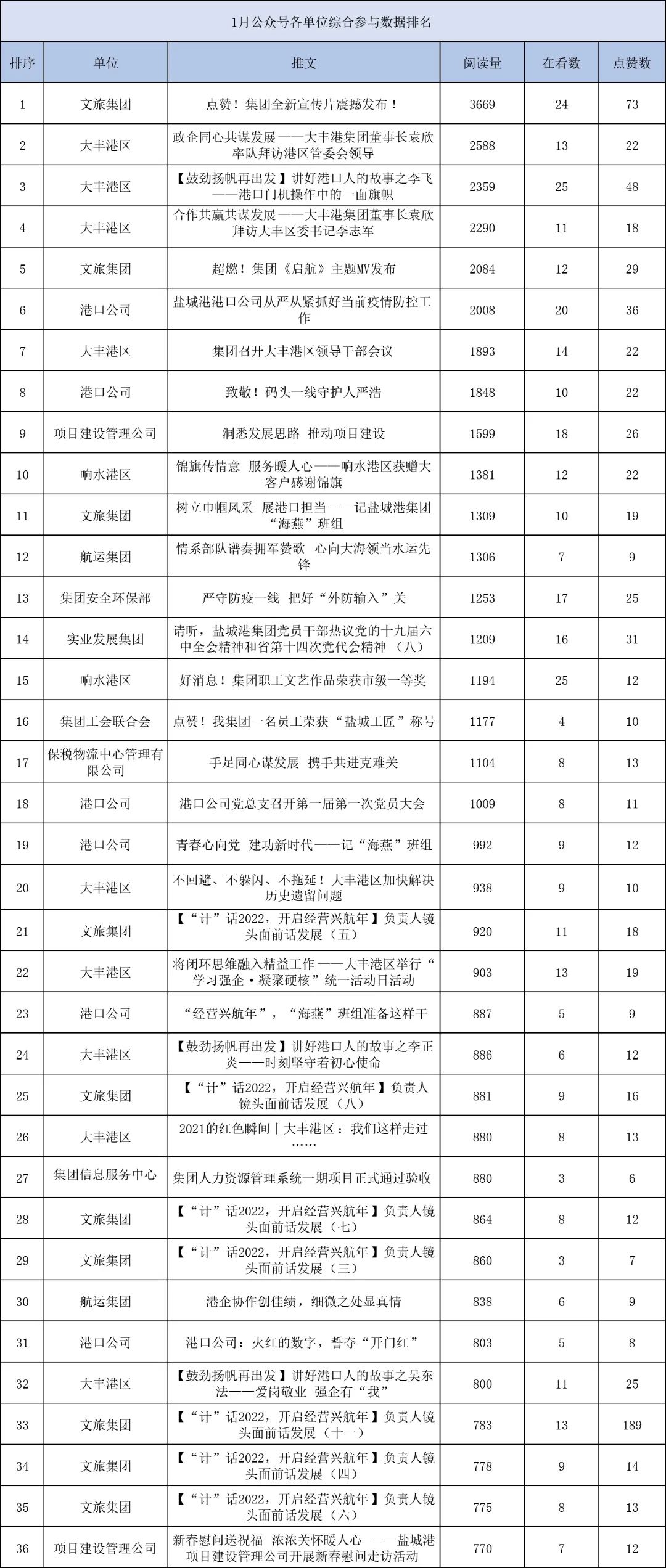 1月,“江蘇鹽城港控股集團(tuán)”微信公眾號(hào)推送文章170篇,截至目前,閱讀總量14萬+,各單位供稿111篇。其中,文旅集團(tuán)以2.1萬閱讀數(shù),24篇稿件量,遙遙領(lǐng)先;大豐港區(qū)以1.8萬閱讀數(shù),16篇稿件量,位列第二;港口公司、響水港區(qū)在供稿方面,以同樣13篇的數(shù)量并列第三,在閱讀量方面,港口公司以1.2萬的數(shù)量,位列單項(xiàng)第三;其他港口及板塊集團(tuán)積極參與,踴躍投稿,情況較好。