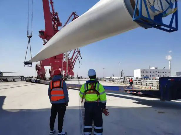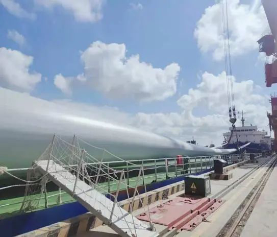 據(jù)了解,該型號風電葉片對集港運輸及裝船吊運標準要求較高。射陽港區(qū)在認真落實疫情防控各項措施的基礎上,與物流單位中悅大件公司密切配合,在裝卸前認真做好各項準備工作,制定詳細作業(yè)方案,選派精干力量組建作業(yè)專班,憑借高超的重大件吊裝技藝,僅用45分鐘便圓滿成功完成99米風電葉片裝卸的平穩(wěn)裝船。優(yōu)質(zhì)高效的風電設備裝船能力得到各方高度認可和一致好評,再一次擦亮了射陽港區(qū)“風電裝卸服務”優(yōu)質(zhì)品牌,以實際行動助力風電產(chǎn)業(yè)的發(fā)展。