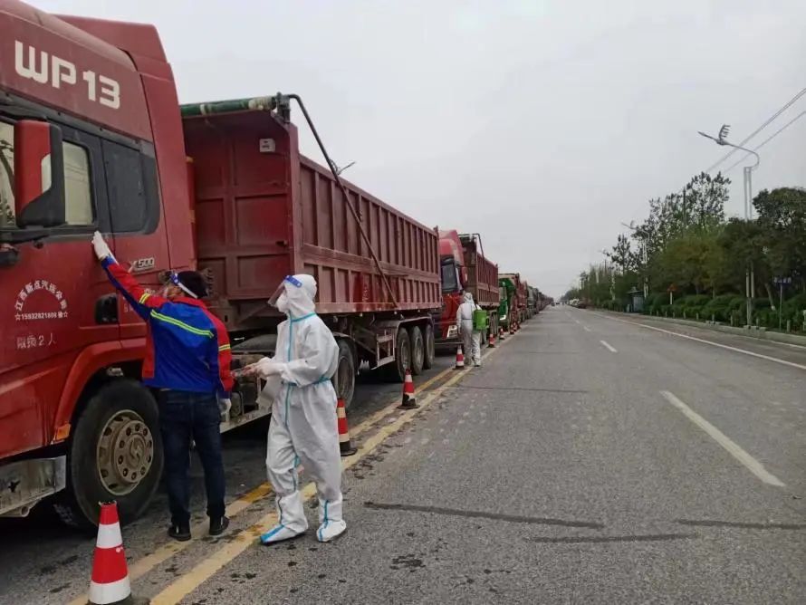 4月26日,接到客戶運輸車輛到達射陽高速出口檢查點,請求協助的電話后,港區立刻成立專項小組穿戴好防護服至高速口開展全程配套服務,及時將運輸車輛引導到港區。