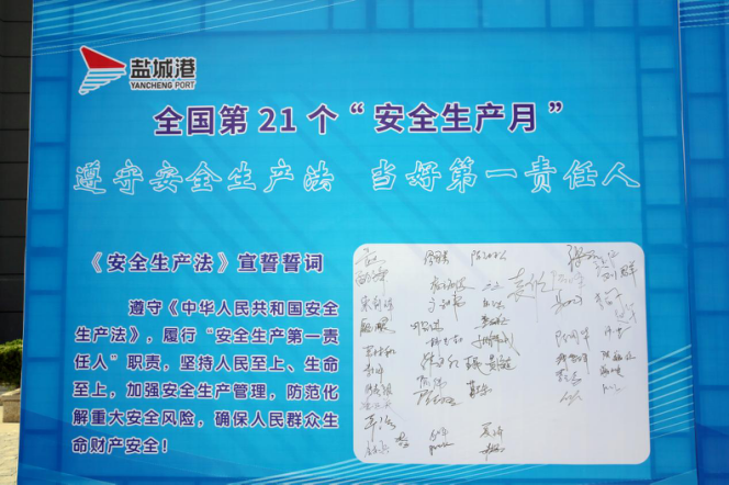 今年6月是全國(guó)第21個(gè)、全省第29個(gè)“安全生產(chǎn)月”,主題是“遵守安全生產(chǎn)法、當(dāng)好第一責(zé)任人”。為促進(jìn)安全生產(chǎn)形勢(shì)持續(xù)穩(wěn)定向好,保障鹽城港集團(tuán)“經(jīng)營(yíng)興航年”各項(xiàng)目標(biāo)指標(biāo)順利完成,按照鹽城港集團(tuán)統(tǒng)一部署,6月2日,大豐港區(qū)舉行2022年安全生產(chǎn)月宣誓承諾活動(dòng)。大豐港區(qū)各二級(jí)公司班子成員及安全條線人員參加。