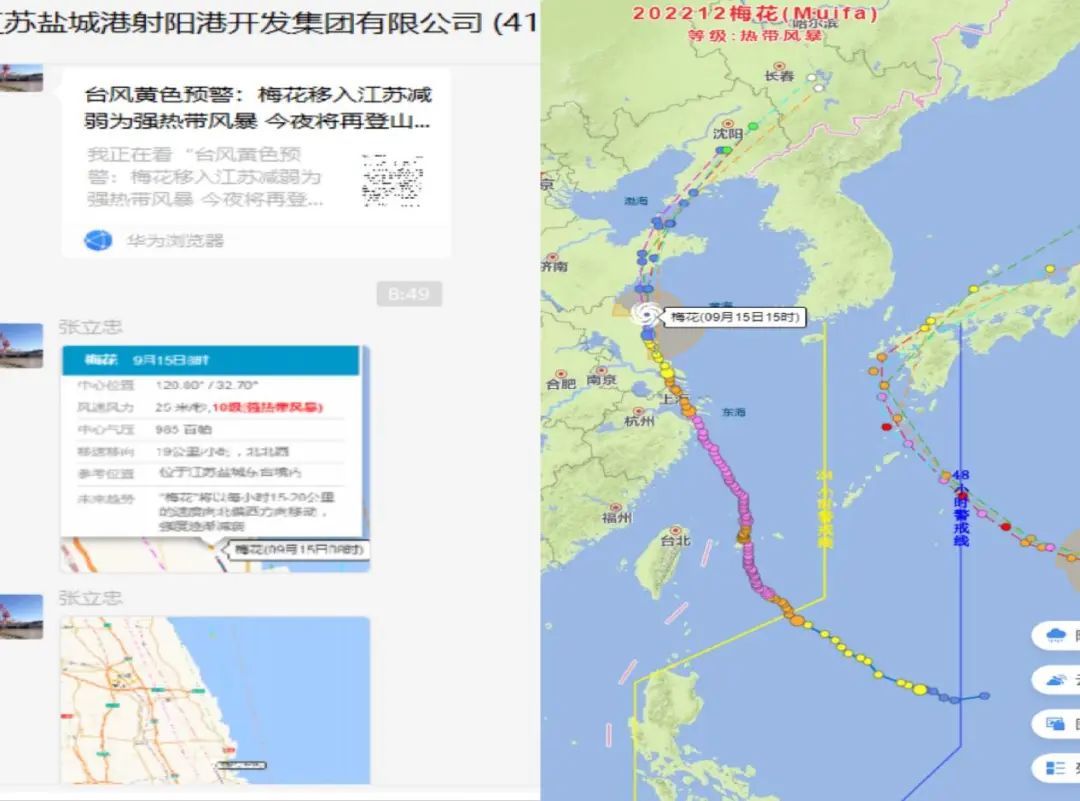 射陽港區(qū)安全環(huán)保部時刻關注臺風動態(tài),加強臺風預報預警,實時發(fā)送臺風路徑,及時啟動防風防臺應急響應,做好預警響應聯(lián)動與臨災“叫應”機制,確保港區(qū)平安。