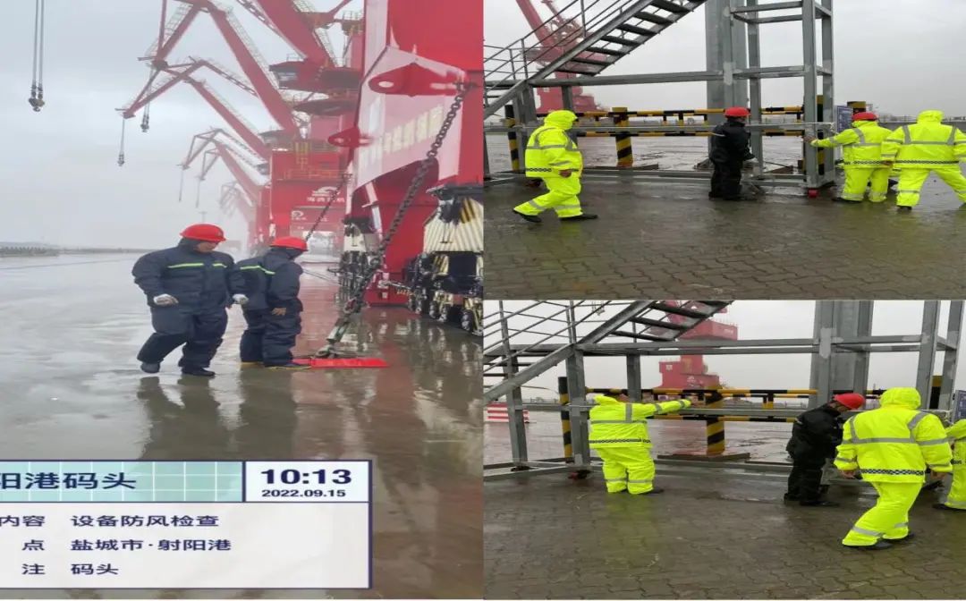 射陽港風電公司第一時間停止碼頭作業(yè),并加大對碼頭面的檢查力度,逐臺檢查設備防風裝置的完好性,加固門機錨定,及時整改現(xiàn)場檢查發(fā)現(xiàn)的問題,時刻做好應戰(zhàn)準備。