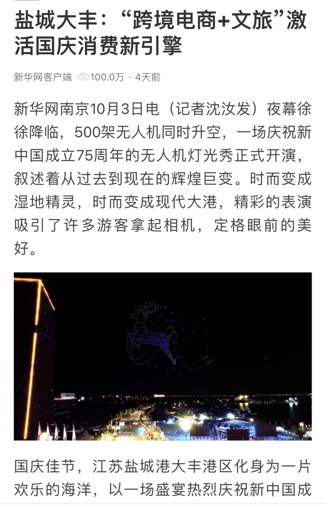 音樂盛宴、“跨境電商+文旅”、無人機(jī)表演……為期七天的國慶黃金周火爆落幕,鹽城港以其獨特的魅力吸引了無數(shù)游客的目光,文旅產(chǎn)業(yè)持續(xù)升溫,游客消費熱情高漲,傳遞著假日經(jīng)濟(jì)的強(qiáng)勁“脈動”。