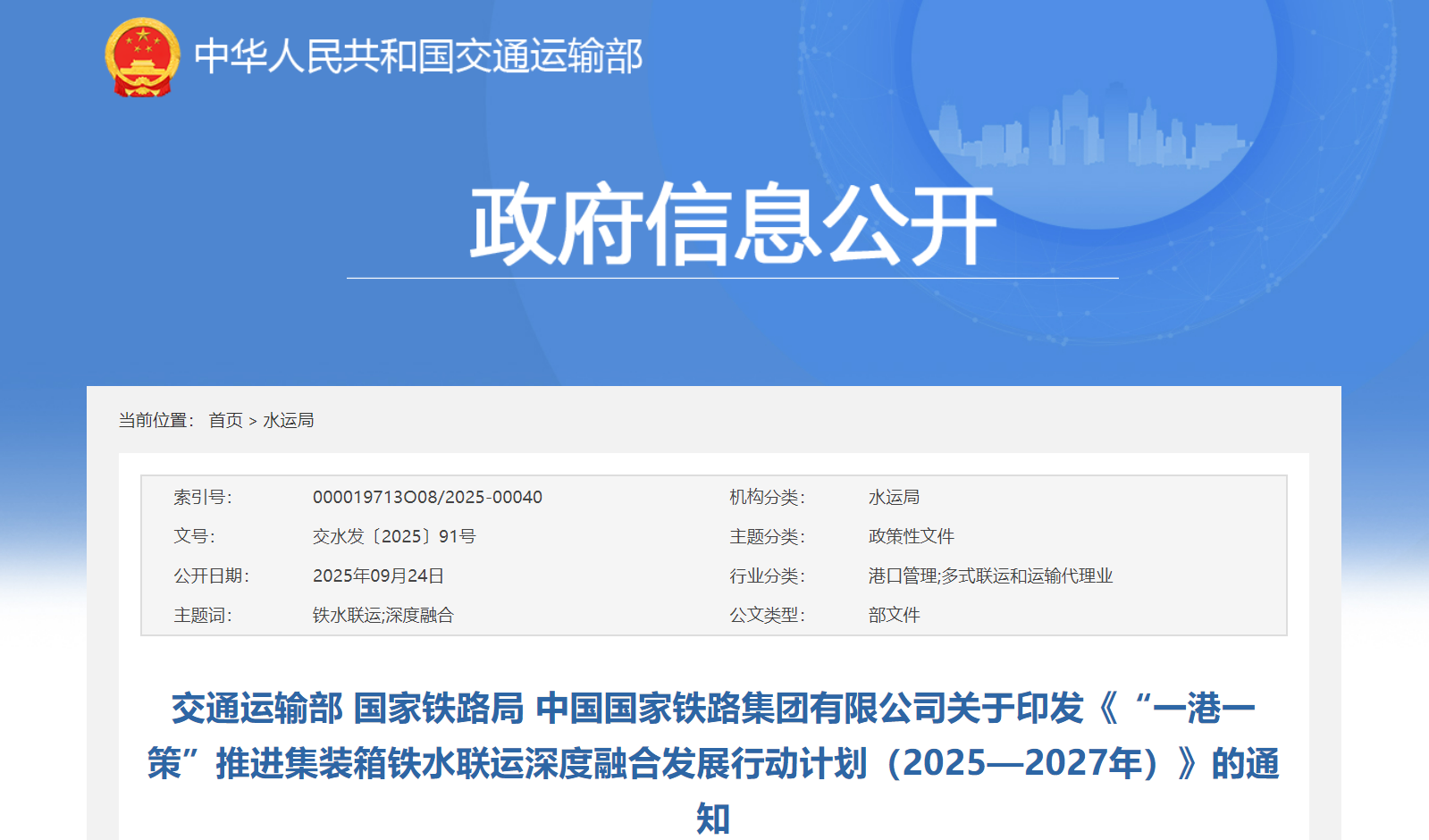 為深入貫徹落實(shí)黨中央、國務(wù)院決策部署,優(yōu)化調(diào)整運(yùn)輸結(jié)構(gòu),進(jìn)一步發(fā)揮綜合運(yùn)輸優(yōu)勢,促進(jìn)有效降低全社會物流成本,現(xiàn)將《“一港一策”推進(jìn)集裝箱鐵水聯(lián)運(yùn)深度融合發(fā)展行動計劃(2025—2027年)》印發(fā)給你們,請認(rèn)真抓好落實(shí)。