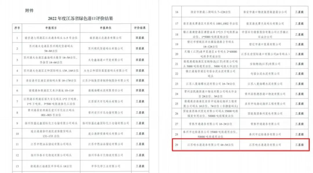 12月21日,2022年度江蘇省綠色港口評(píng)價(jià)結(jié)果揭曉,江蘇響水港港務(wù)有限公司4#-5#泊位獲得“江蘇省三星級(jí)綠色港口”榮譽(yù)稱號(hào)。