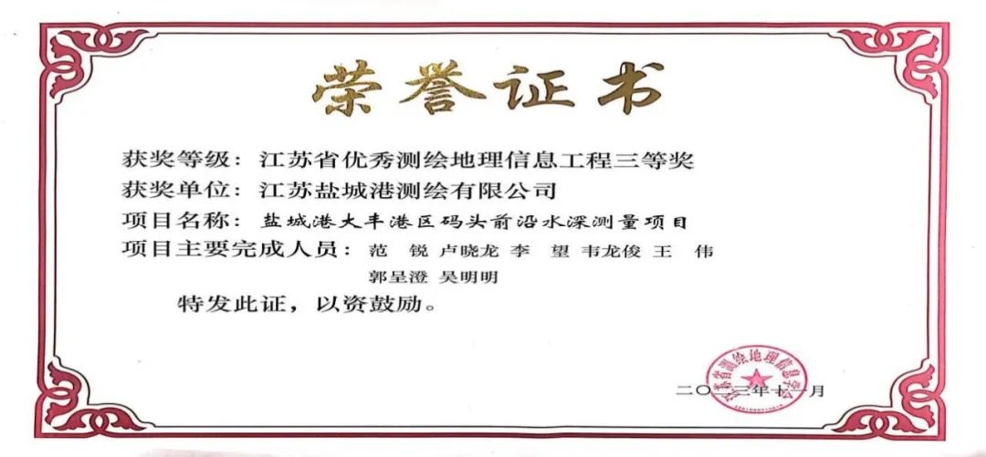 近日,江蘇省測繪地理信息學(xué)會公布2023年度江蘇省優(yōu)秀測繪地理信息工程獲獎名單,鹽城港大豐港區(qū)碼頭前沿水深測量項(xiàng)目榮評2023年度江蘇省優(yōu)秀測繪地理信息工程三等獎。