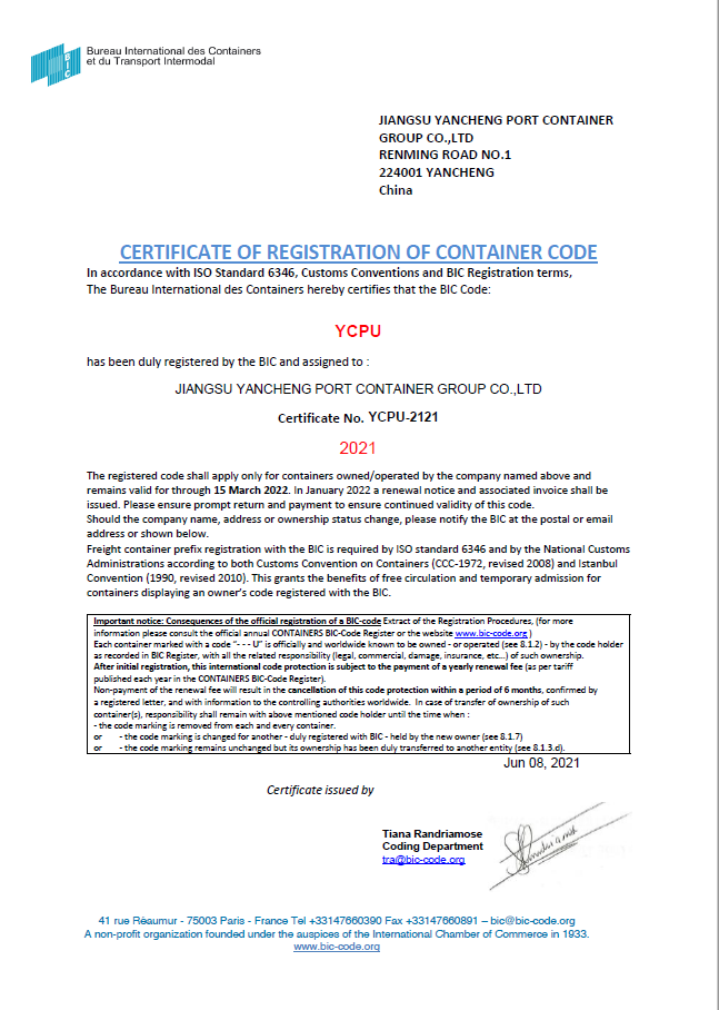 6月10日,從國際集裝箱局(法國)傳來喜訊,鹽城港集團自備的200只集裝箱,全部完成前綴YCPU的注冊登記手續(證書編號:YCPU-2121),正式成為可以全球流通的集裝箱。自此,鹽城港自備箱在世界上有了自己的名字—“YCPU”,拿到了自己的“環球通行證”。